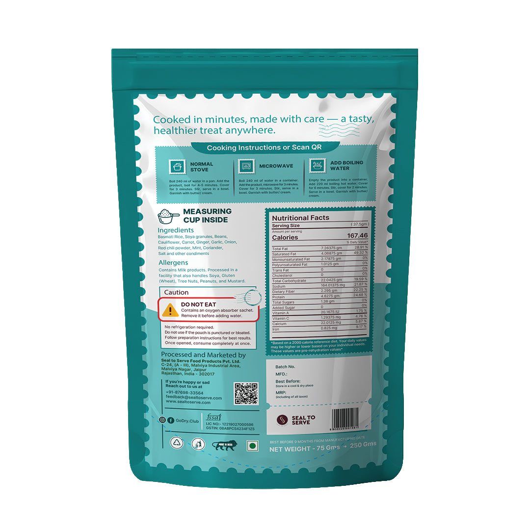 Fragrant basmati rice layered with vegetables, soya granules, mint, coriander, and golden spices, slow-cooked to perfection. A light yet indulgent dish that captures the essence of royal Indian kitchens.